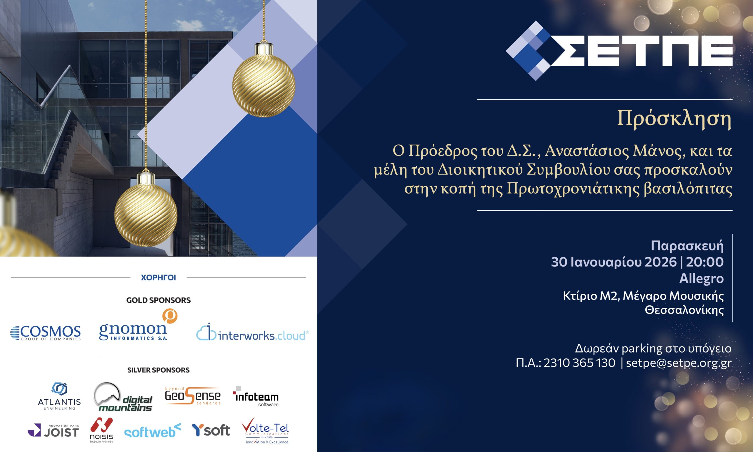 Με την καθιερωμένη κοπή της Πρωτοχρονιάτικης βασιλόπιτας, ο Σύνδεσμος Επιχειρήσεων Τεχνολογίας Πληροφορικής Ελλάδος (ΣΕΤΠΕ) δίνει το εναρκτήριο στίγμα της νέας χρονιάς, σε εκδήλωση που θα πραγματοποιηθεί την Παρασκευή 30 Ιανουαρίου 2026 και ώρα 20.00 στο Allegro (κτίριο Μ2) του Μεγάρου Μουσικής Θεσσαλονίκης.