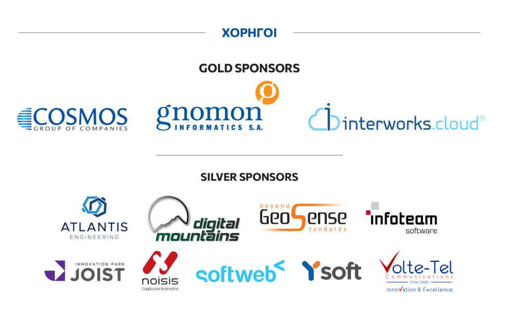 Gold Sponsors της εκδήλωσης είναι οι  εταιρείες: COSMOS BUSINESS SYSTEMSINTERWORKS.CLOUDΓΝΩΜΩΝ ΠΛΗΡΟΦΟΡΙΚΗΣ  Α.Ε. και Silver Sponsors οι εταιρείες: ATLANTIS ENGINEERINGDIGITAL MOUNTAINSGEOSENSEINFOTEAM HELLASJOIST INNOVATION PARKNOISIS ΣΥΜΒΟΥΛΟΙ ΑΝΑΠΤΥΞΗΣ Α.Ε.SOFTWEBYSOFTVOLTE-TEL COMMUNICATIONS, οι οποίες με τη  στήριξη τους συμβάλλουν καθοριστικά στην επιτυχία της εκδήλωσης και αναδεικνύουν τον ρόλο του ΣΕΤΠΕ ως ενεργού φορέα που προάγει τη συνεργασία και ενισχύει τον τεχνολογικό τομέα στην Ελλάδα.