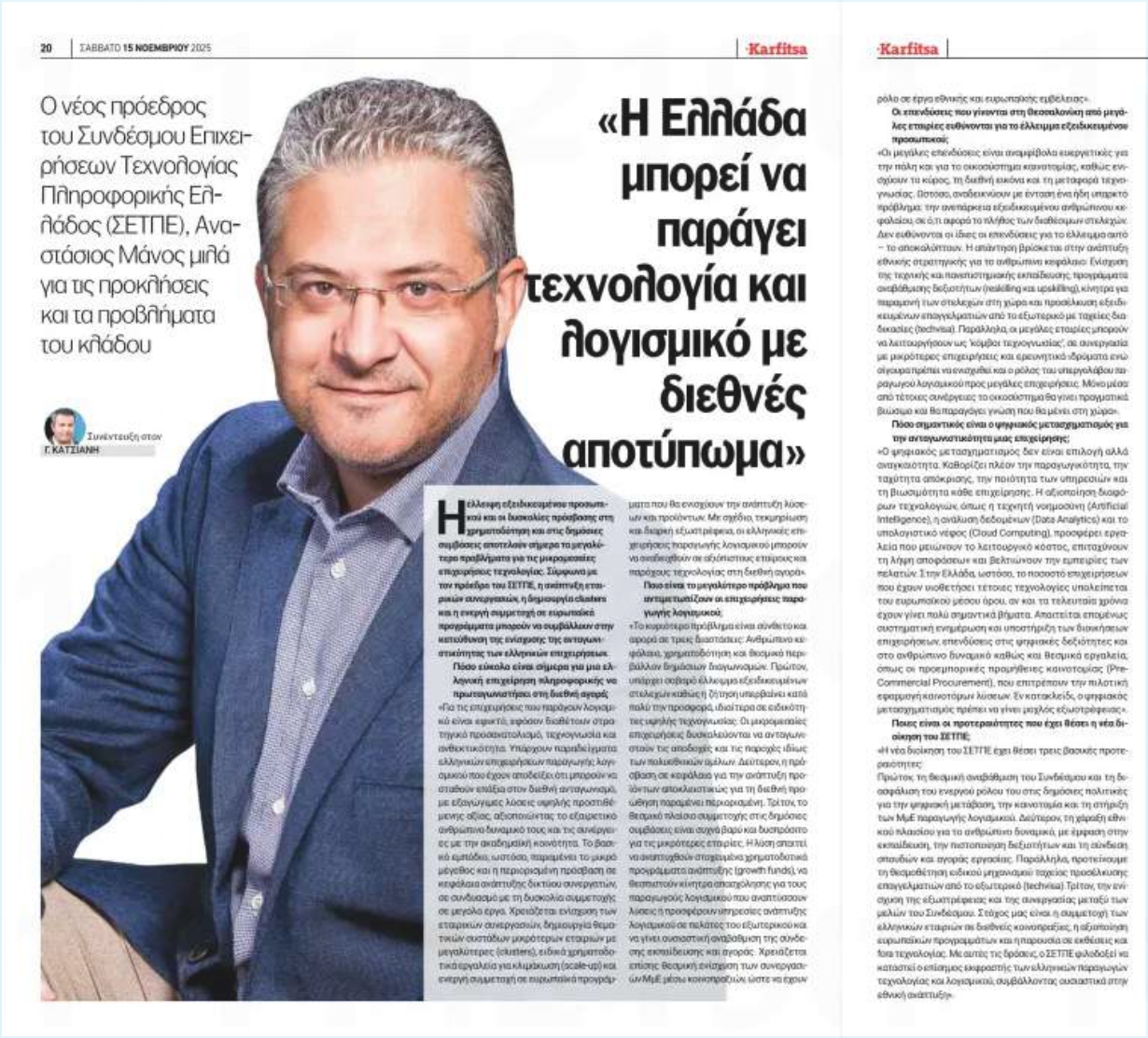 Η Ελλάδα μπορεί να παράγει τεχνολογία και λογισμικό με διεθνές αποτύπωμα, εφόσον καλλιεργηθούν νέες συνέργειες, αξιοποιηθούν οι δυνατότητες των στελεχών πληροφορικής και εξασφαλιστεί πρόσβαση σε αναπτυξιακά κεφάλαια, υπογράμμισε ο πρόεδρος του Συνδέσμου Επιχειρήσεων Τεχνολογίας Πληροφορικής Ελλάδος (ΣΕΤΠΕ), Αναστάσιος Μάνος, σε συνέντευξή του στην εφημερίδα «Karfitsa».